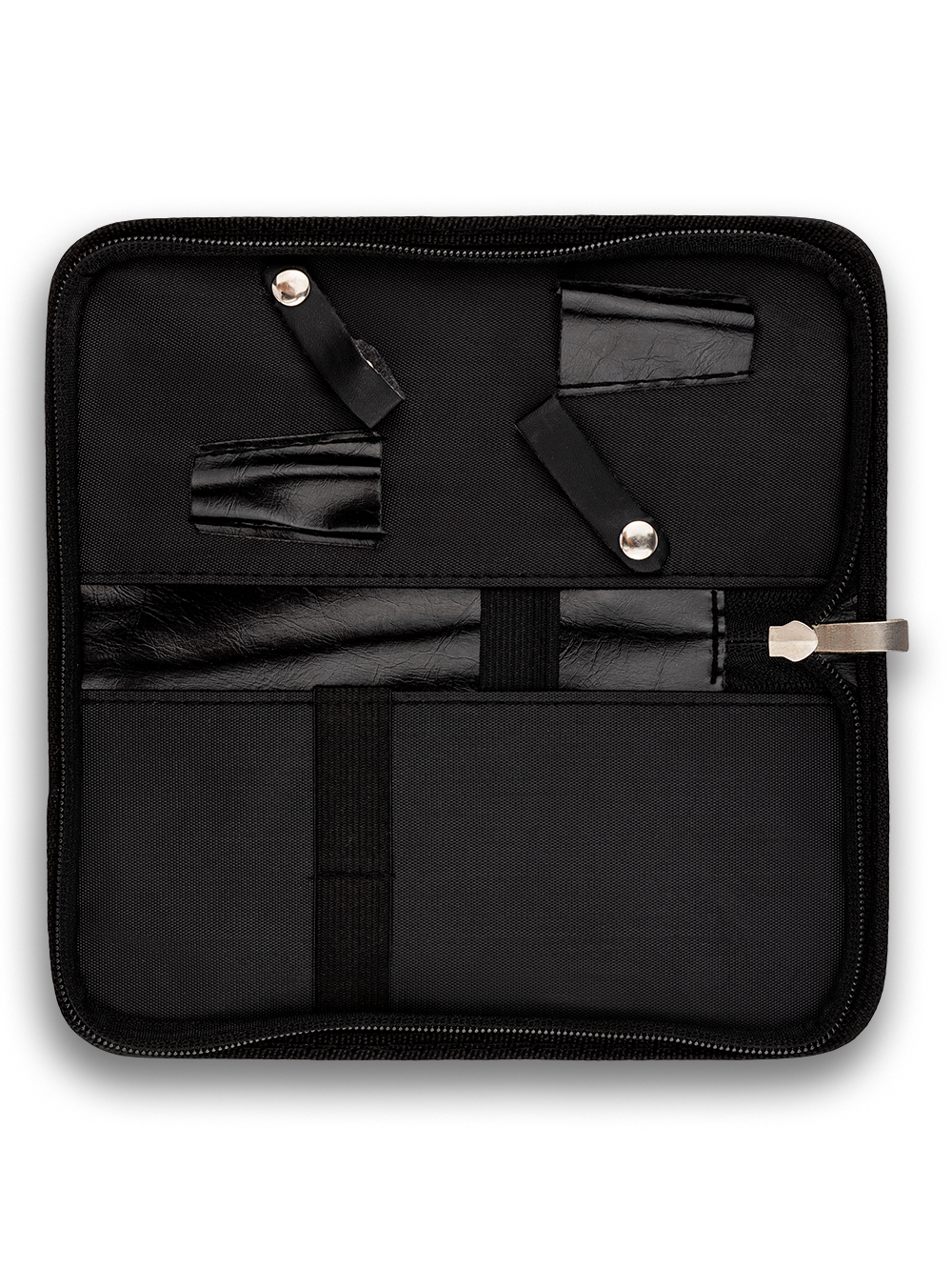 Аксессуар выполнен из высококачественной экокожи черного цвета, Внутри предусмотрено место для двух пар ножниц, а также отделения для расчесок различных размеров, - это обеспечит удобство и порядок. Молния надежно защищает содержимое, предотвращая случайное выпадение инструментов.